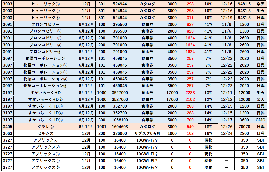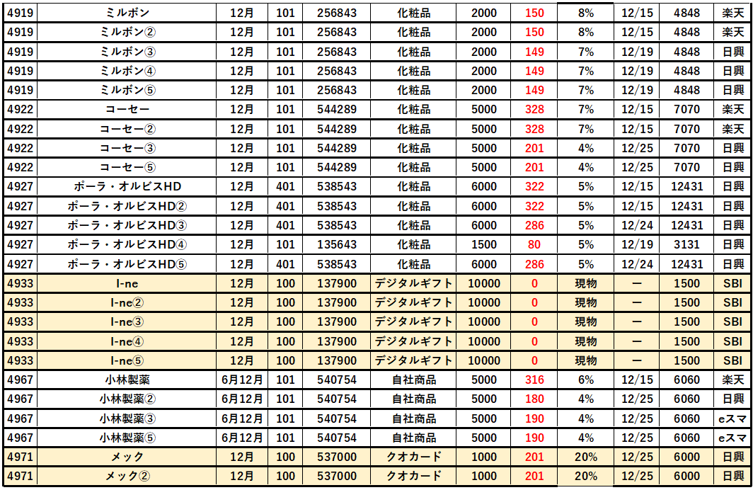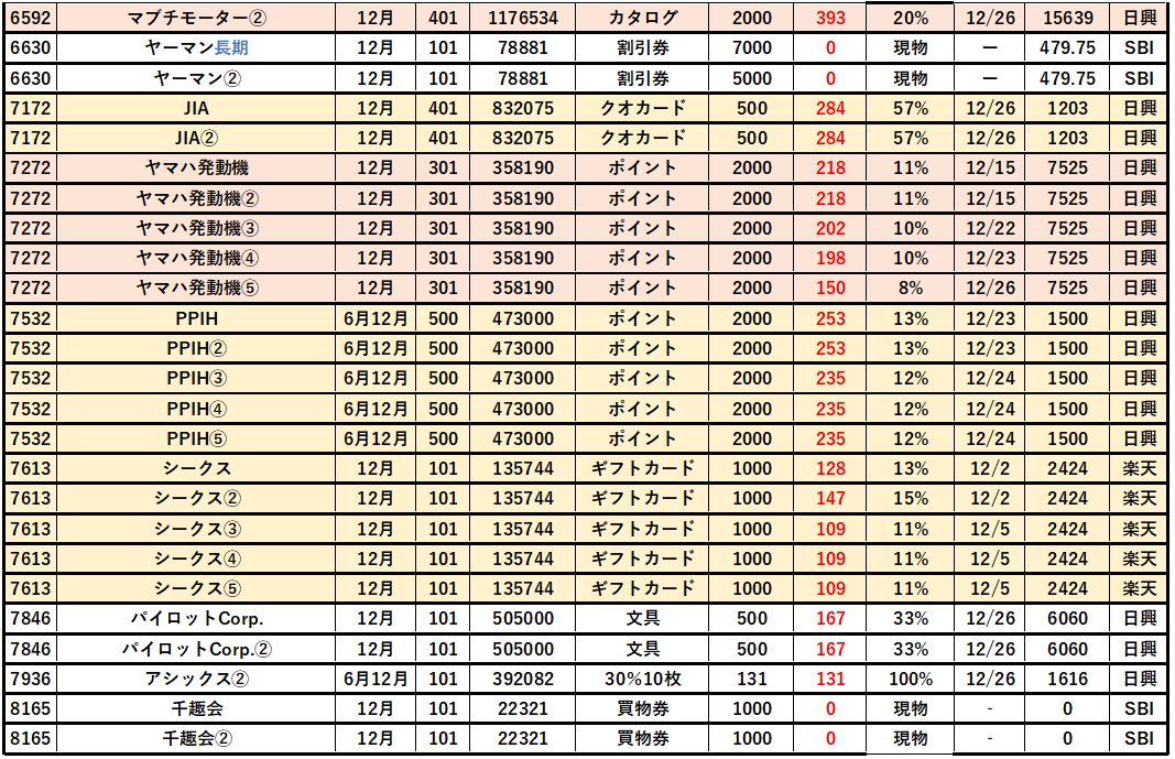 【12月】株主優待クロス「取得結果」は50銘柄153個(2025)